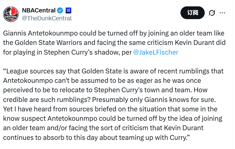 “联盟消息人士透露,勇士方面已察觉到近期的一些流言:外界此前默认字母哥会迫切渴望加入库里所在的球队、来到这座城市,但事实可能并非如此。这类流言的可信度究竟有多高?想必只有字母哥本人最清楚。不过,据知情人士透露,一些圈内人猜测,字母哥或许会打退堂鼓 —— 一方面是因为勇士阵容年龄偏大,另一方面则是他不想落得和杜兰特一样的下场,至今仍因当年联手库里而饱受诟病。”